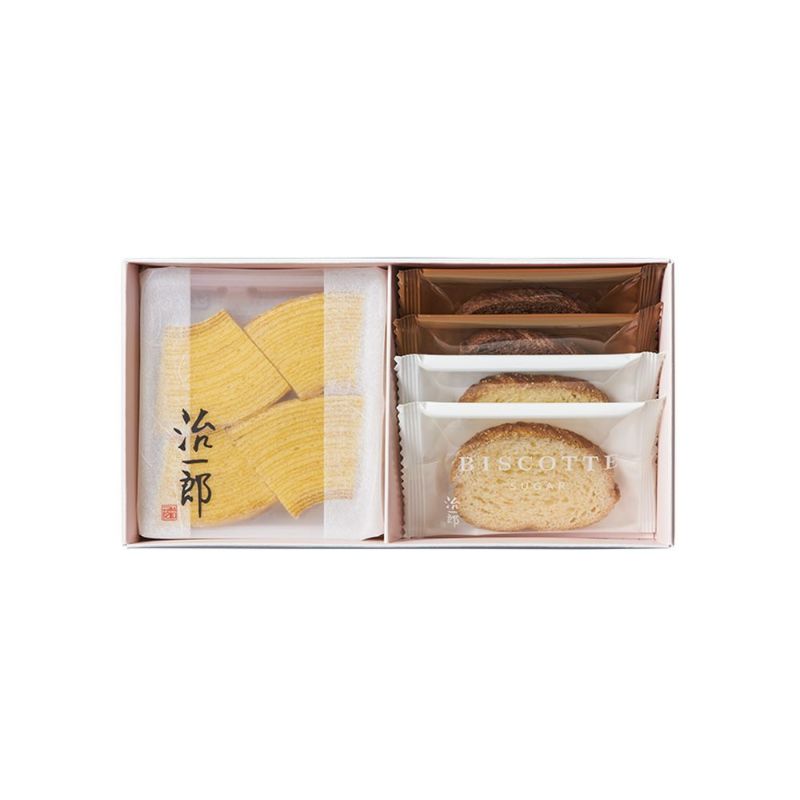 治一郎のバウムクーヘンカット2袋、ビスコット「シュガー」「ショコラ」各2枚を詰め合わせました。
